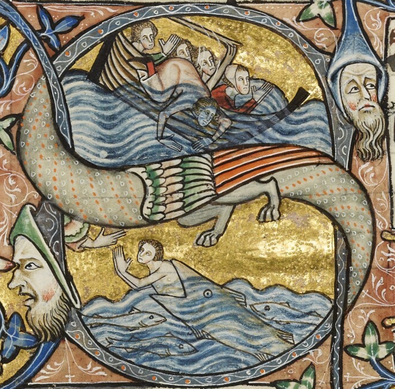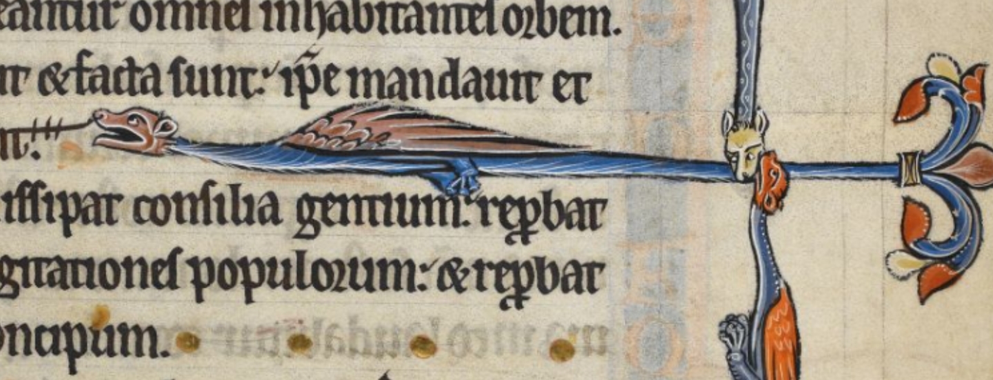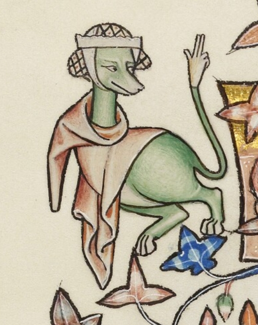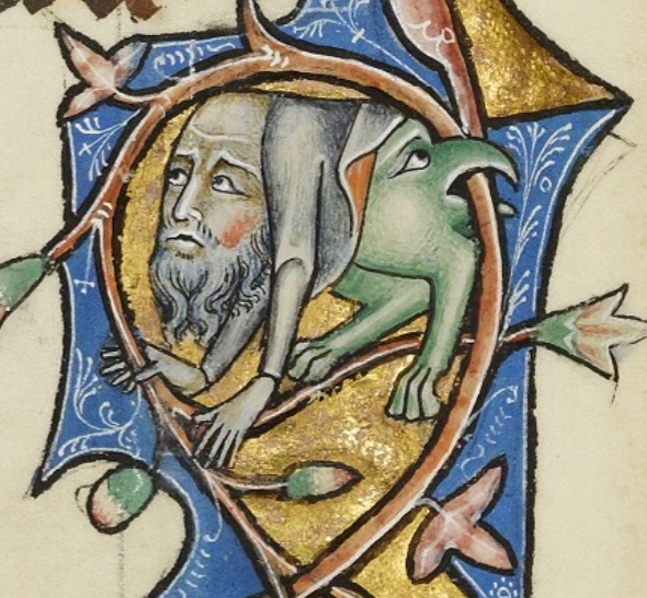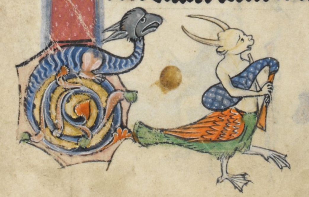 Psalter images are often surprising for a religious text, and mostly do not illustrate the text they accompany. Animal imagery is common, with scenes from the bestiary, Reynard the Fox and other fables, and scenes of daily life. Illustrations of biblical stories do appear, but not with the frequency that might be expected. Psalters are frequently illustrated with hybrid creatures, odd and often whimsical combinations of two or more animals, sometimes with human faces or human bodies with animal heads or body parts. Serpents and other dragon-like beasts are used as decorative elements, winding around borders and forming initial letters. The beasts often interact with each other or with other decorative elements on the page.