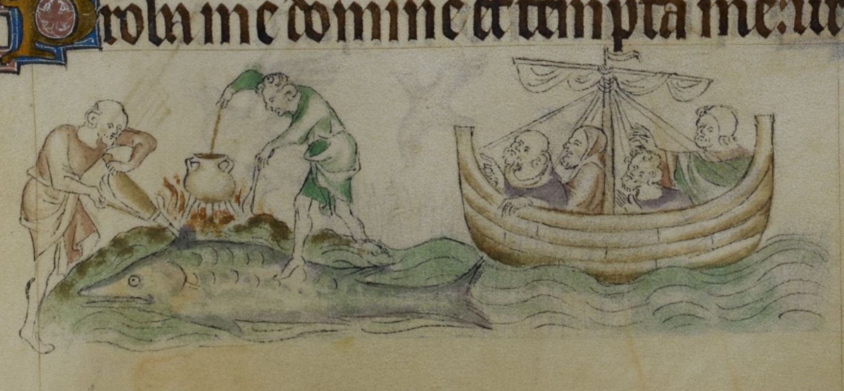 The bottom margin of the manuscript page was used for more extensive illustrations, such as scenes from the bestiary. One manuscripts, the Queen Mary Psalter, has a more or less complete bestiary in pictures in the bottom margin.