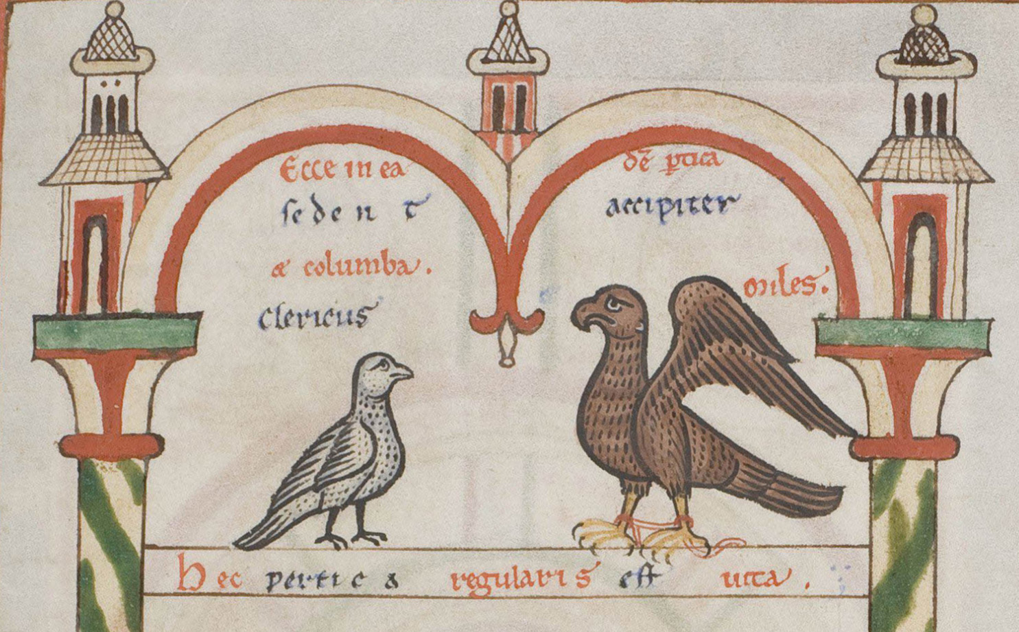 Desiring to fulfill your wishes, dearest friend, I decided to paint the dove whose wings are silvered and the hinderparts of the back in pale gold (Ps. 67:14), and by a picture to instruct the minds of simple folk, so that what the intellect of the simple folk could scarcely comprehend with the mind's eye, it might at least discern with the physical eye; and what their hearing could scarcely perceive, their sight might do so. I wished not only to paint the dove physically, but also to outline it verbally, so that by the text I may represent a picture; for instance, whom the simplicity of the picture would not please, at least the moral teaching of the text might do so. Therefore, for you to whom the dove's feathers are given, who fled the world in order that you might stay and rest in solitude, who do not seek delay with a raven's cry, eras, cras, but repentance with a dove's sigh, for you I say, I shall now paint not only the dove, but also the hawk.
